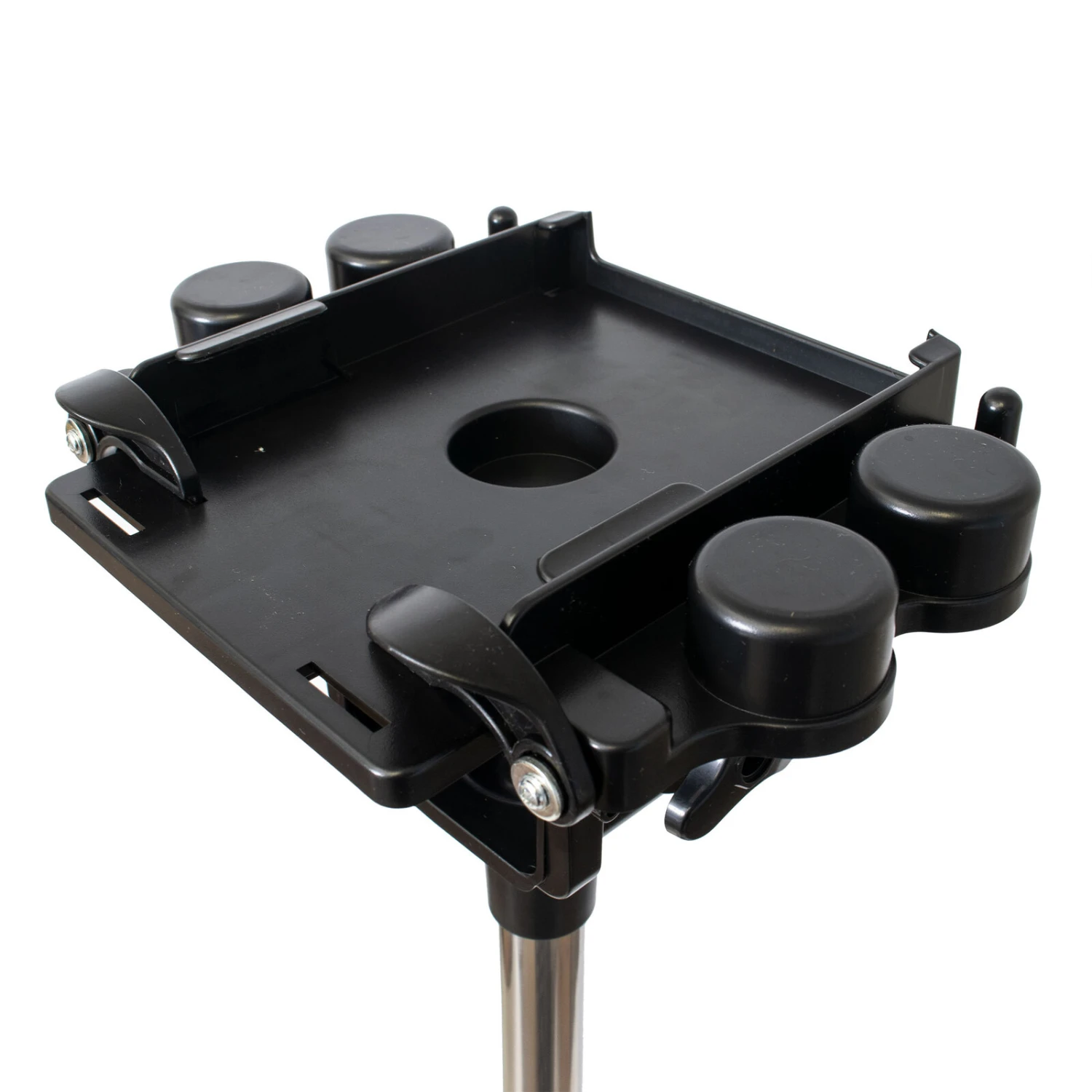 - Highly stable extended base with spring assisted adjustable height and multiple adjustable dryer caddy positions